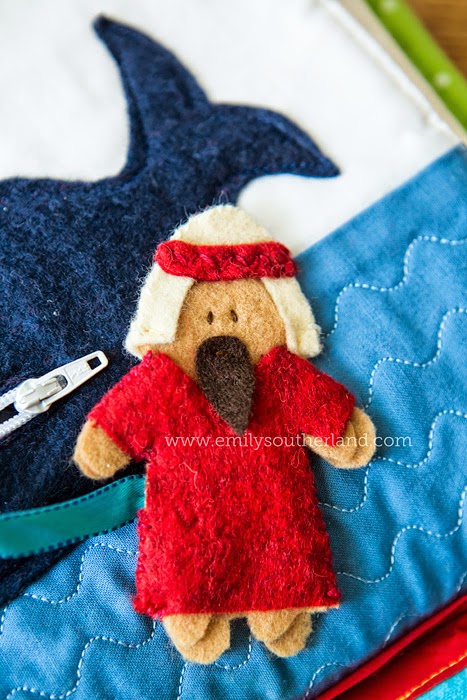 And a detail shot of the hand-stitched Jonah and the fun machine-stitched wave pattern. Yay, Glori for using some cotton among the felt! And Jonah, you're so cute.